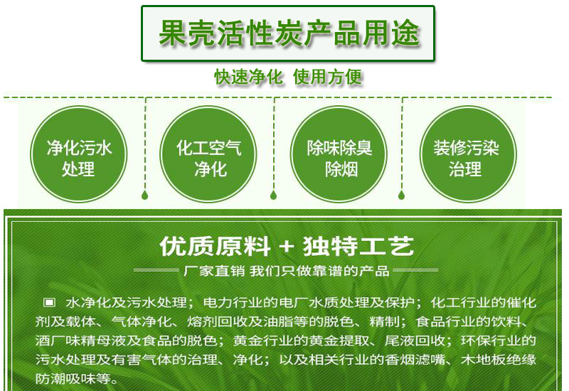 水處理應(yīng)用:產(chǎn)品采用優(yōu)質(zhì)果殼、椰殼為原料,廣泛應(yīng)用于飲用水、生活用水,飲料用水、自來水廠、電廠鍋爐用水、工業(yè)純水凈化,也用于各種工業(yè)廢水的凈化、提純等,可有效去除水中的有機(jī)物、異味、余氯、酚、汞、鐵、鉛、砷、鉻、硅膠、氰化物等有害物質(zhì)及有效除嗅去色。